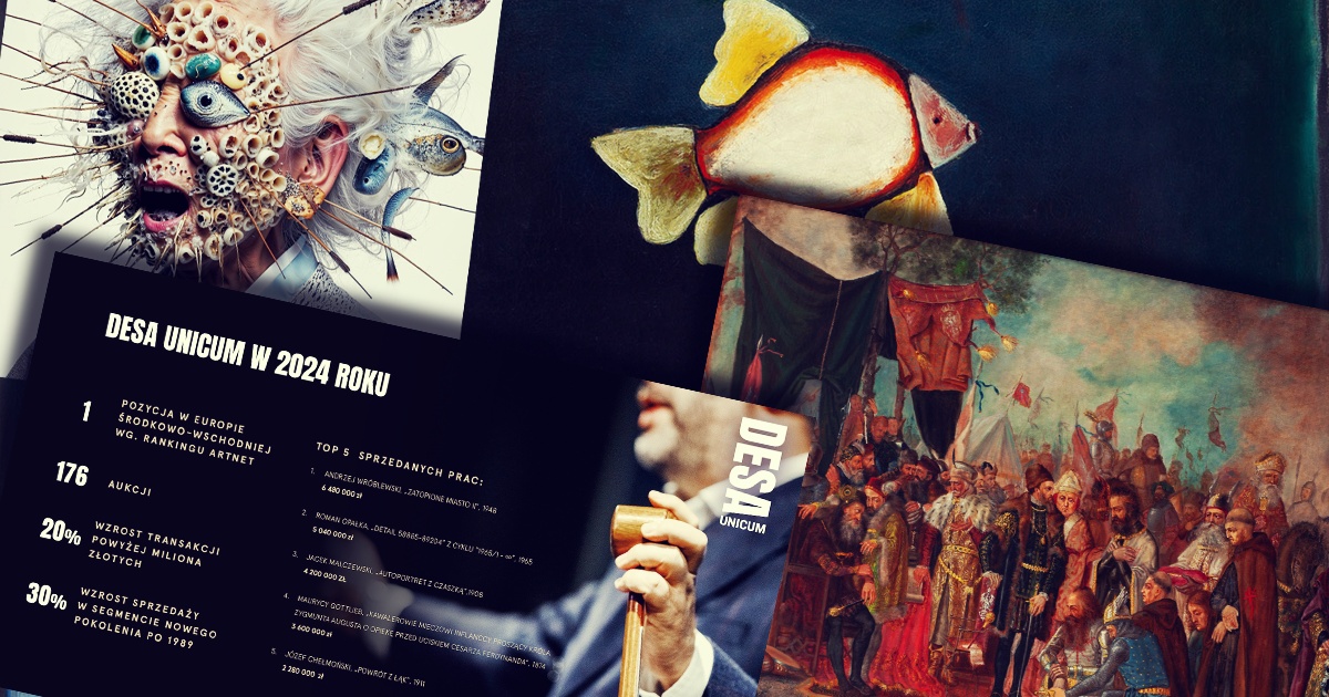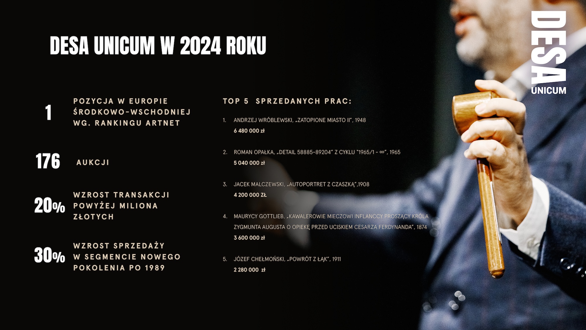 DESA Unicum zamyka 2024 r. z ponad 30 transakcjami powyżej 1 mln zł, z genialnymi projektami, jak licytacja gitar Jana Borysewicza czy obrót kolekcją Kunczyńskich, wśród której znalazło się 30 niewidzianych prac Tadeusza Brzozowskiego. Najwyższe obroty DESA osiągnęła w grudniu (83,5 mln zł), wtedy również, za 6,48 mln zł, sprzedano najdroższe działo minionego roku „Zatopione miasto II” Andrzeja Wróblewskiego. Spośród ważniejszych wydarzeń wymienia się również rekord sprzedaży na płótnie Maurycego Gottlieba „Kawalerowie Mieczowi inflanccy proszący króla Zygmunta Augusta o opiekę przed uciskiem cesarza Ferdynanda” (3,6 mln zł), oraz najdrożej sprzedany autoportret Jacka Malczewskiego „Autoportret z czaszką” za 4,2 mln zł.