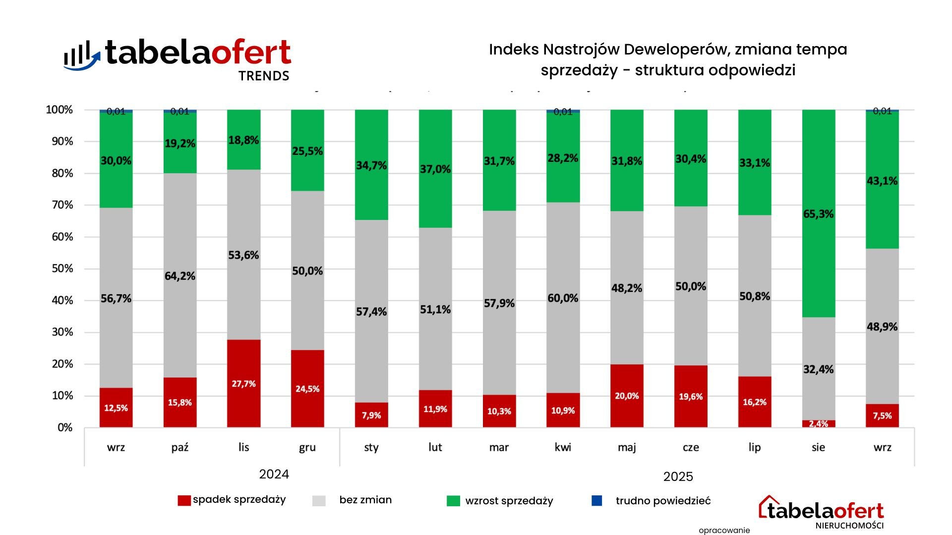 Nic dziwnego, że dziś mniej deweloperów spodziewa się dalszego wzrostu sprzedaży– wrześniowe wyniki spowodowały, że mają realistyczne oczekiwania i zdają sobie sprawę, że sprzedaż nie może rosnąć w nieskończoność. Dlatego zwiększył się odsetek deweloperów spodziewających się stabilizacji sprzedaży