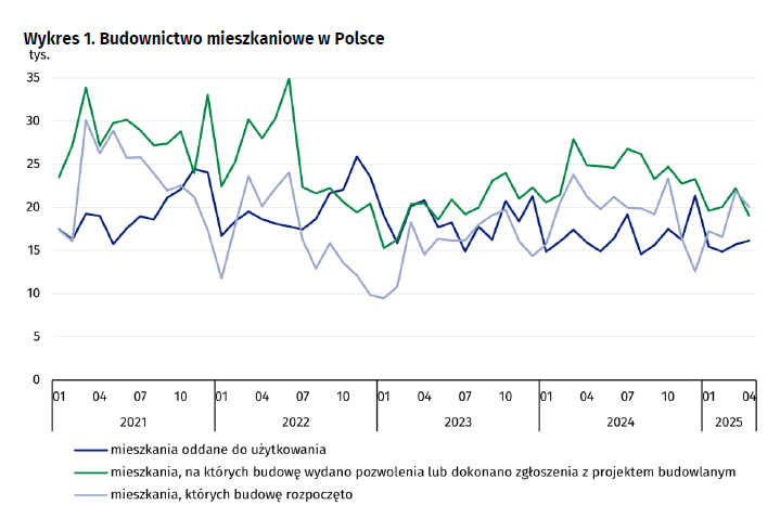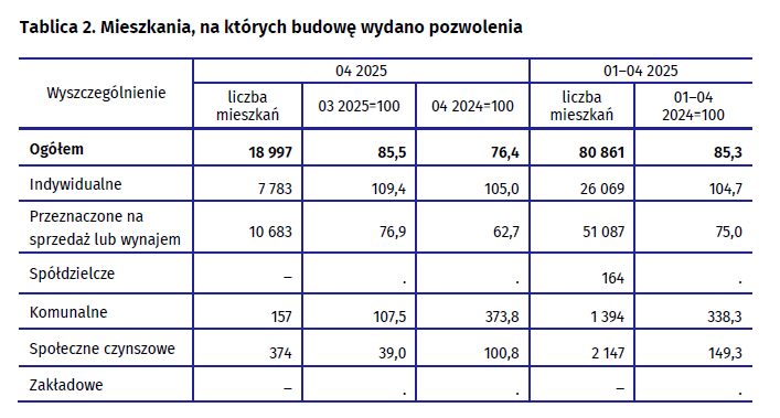 Od początku stycznia do końca kwietnia 2025 roku wydano pozwolenia na budowę ponad 80 tys. mieszkań, to o 14,7 proc. mniej niż w tym samym okresie przed rokiem. Deweloperzy otrzymali ponad 51 tys. z wydanych pozwoleń, co jest 25 proc. spadkiem r/r. Porównując kwietniowe dane z marcowymi liczba pozwoleń wydanych deweloperom spadła o 2,6 proc. Inwestorzy indywidualni odpowiadają za 26 tys. pozwoleń (wzrost o 4,7 proc.).