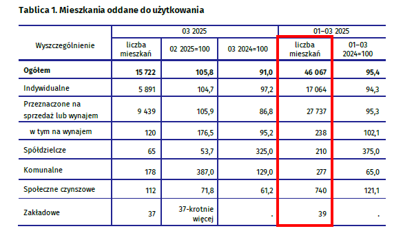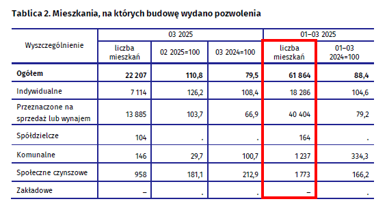 W pierwszym kwartale 2025 roku odnotowano mniejszą liczba mieszkań przekazanych do użytkowania. Spadła również liczba wydanych pozwoleń i rozpoczętych budów.