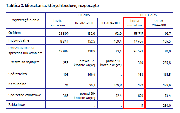 W analizowanym okresie deweloperzy rozpoczęli budowę 36,5 tys. mieszkań, to aż 13 proc. spadek względem analogicznego okresu 2024 roku. Łącznie w I kw. rozpoczęto budowę 55,7 tys. mieszkań, przy czym inwestorzy indywidualni dopowiadają za 18 tys. nowych lokali (tu znowu lekki wzrost o 5,5 proc.). Jednak względem lutego, liczba rozpoczętych budów wzrosła o 32 proc.