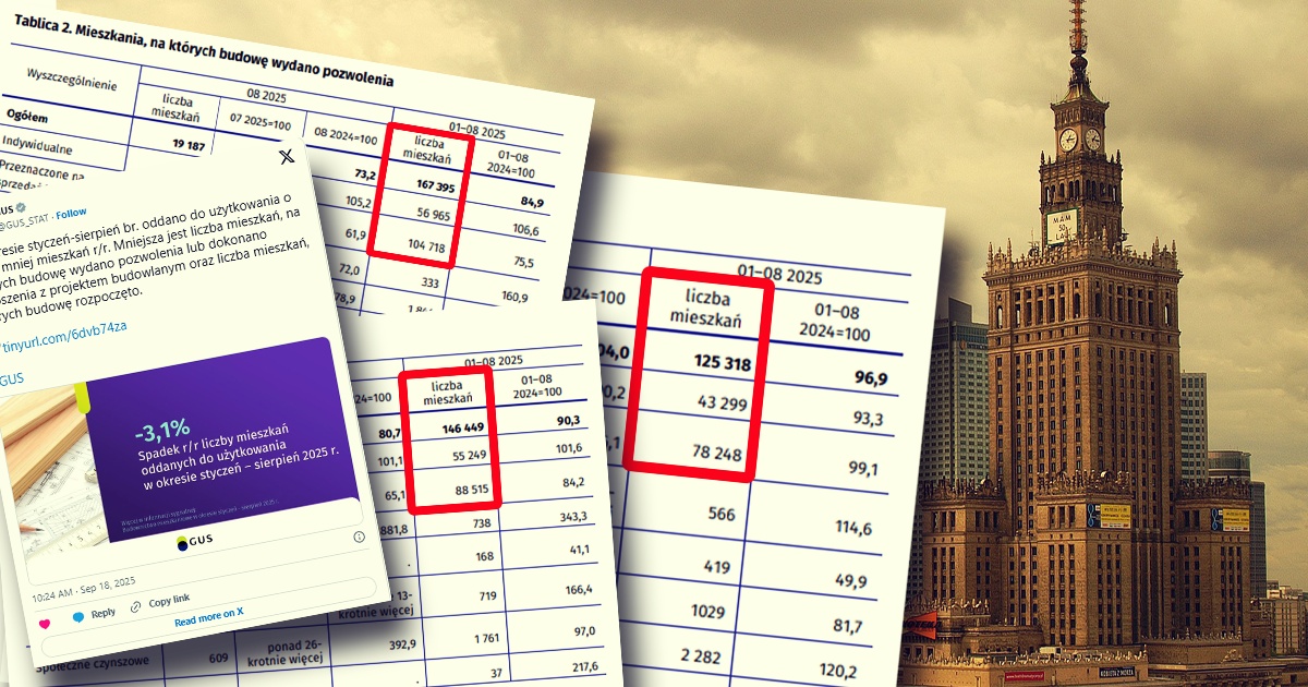 Główny Urząd Statystyczny (GUS) opublikował dane o budownictwie mieszkaniowym za okres styczeń–sierpień 2025 roku. W porównaniu z analogicznym okresem 2024 roku spadły wszystkie wskaźniki monitorowane przez urząd – liczba oddanych mieszkań, wydanych pozwoleń i zgłoszeń budowy, a także rozpoczętych inwestycji.