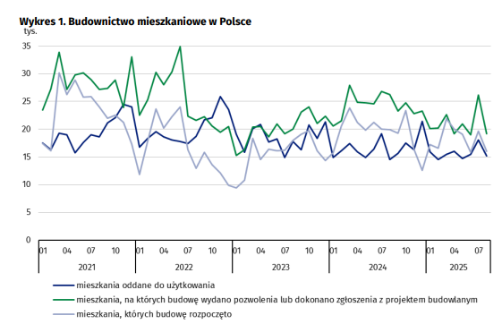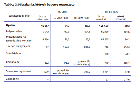 Statystyki GUS z poprzednich miesięcy dotyczące rozpoczynanych w całej Polsce budów wskazywały, że wyniki z lipca (wyraźny wzrost) mogą być początkiem nowej tendencji wzrostowej. Jednak sierpień negatywnie zweryfikował te nadzieje. Liczba budów rozpoczętych w ciągu miesiąca przez wszystkie grupy inwestorów była wyraźnie niższa niż w lipcu (-18 proc.) i sierpniu 2024 roku (-19 proc.) (...) Bieżące dane GUS o rozpoczynanych budowach ogółem należy interpretować także w kontekście statystyki udzielanych pozwoleń. Od początku roku różnica między liczbą uzyskanych pozwoleń a liczbą rozpoczynanych budów wynosi 20 tys., co oznacza, że 12,5 proc. uzyskiwanych pozwoleń ogółem nie ma kontynuacji w realizowanych budowach. Wśród firm deweloperskich odsetek odkładanych pozwoleń jest większy i wynosi 15,5 proc., podczas gdy wśród gospodarstw domowych nie przekracza 3 proc.
