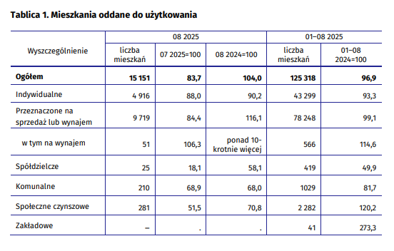 Od stycznia do sierpnia 2025 roku w całej Polsce do użytku oddanych zostało 125,3 tys. mieszkań i domów, co oznacza najsłabszy od siedmiu lat wynik. Ostatni raz GUS odnotował od stycznia do sierpnia mniej niż 126 tys. lokali oddanych do użytkowania w 2018 roku
