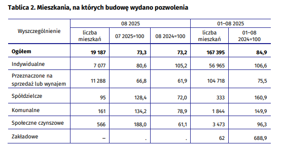 Do końca sierpnia w Polsce wydano 167,4 tys. pozwoleń na budowę mieszkań, co oznacza spadek o ponad 15 proc. r/r. Nieco ponad 104 tys. z nich trafiło do deweloperów – to wynik niższy o 24,5 proc. niż przed rokiem. Inwestorom indywidualnym przypadło 57 tys. pozwoleń, co oznacza wzrost o 6,6 proc. r/r.