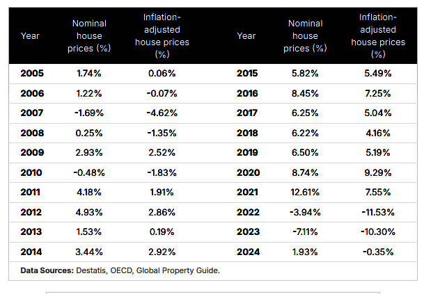 20-letnia roczna zmiana cen nieruchomości (na podstawie indeksu cen nieruchomości na koniec roku i indeksu cen konsumpcyjnych)