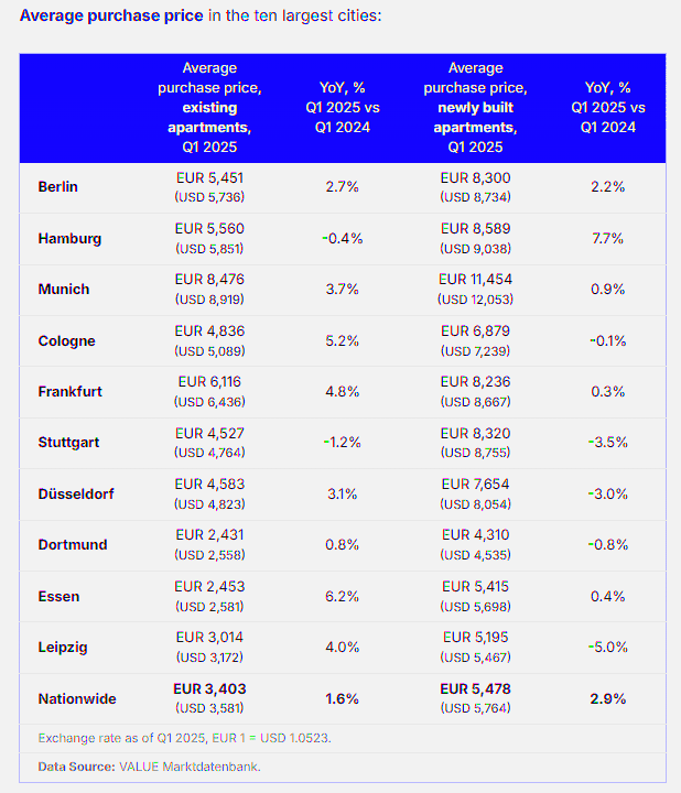 Zgodnie z danymi Velue Maektdatenbank pierwszy kwartał 2025 roku pokazał na niemieckim rynku nieruchomości mieszkaniowych pierwszy wzrost cen mieszkań. Średnia krajowa z rynku wtórnego w ujęciu rocznym wzrosła o 1,6 proc. (3 403 euro). Z kolei średnia cena mkw. nowego mieszkania wyniosła 5 478 euro, co było 2,9 proc. wzrost r/r. Spośród 10 największych ujętych w badaniu miast, najdrożej było w Monachium, gdzie w przypadku nowych mieszkań trzeba było zapłacić 11 454 euro, a za mieszkanie z rynku wtórnego 8 476 euro.