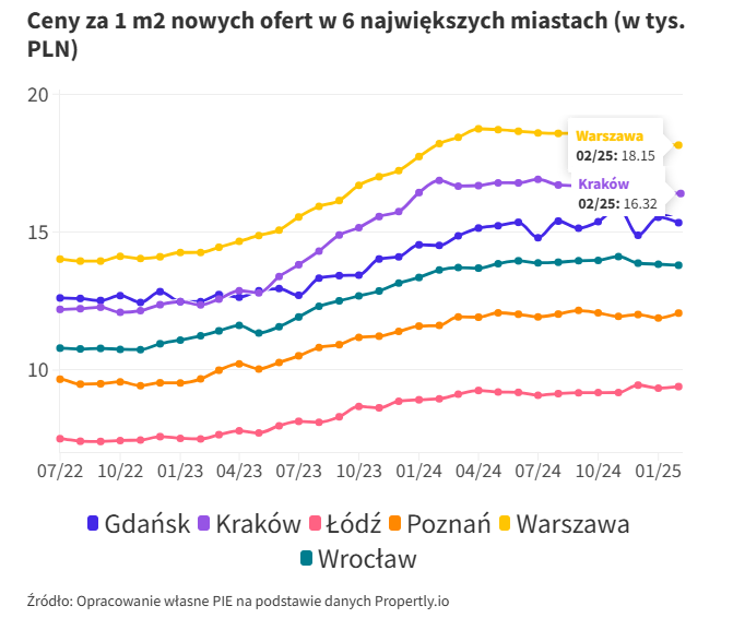 Zgodnie z analizą Polskiego Instytutu Ekonomicznego (PIE), ceny mieszkań w lutym nieznacznie wzrosły. W grupie sześciu największych miast wzrost wyniósł zaledwie 0,2 proc. w porównaniu do stycznia br. Instytut zauważa, że jest to pierwszy wzrost cen w grupie dużych miast od ponad pół roku. Średnia cena metra kwadratowego na obu rynkach wyniosła 15,4 tys. zł.