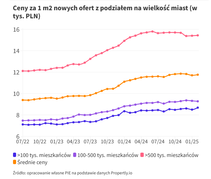 W największych miastach Polski w lutym 2025 r. średnia cena m2 mieszkania wyniosła na obu rynkach 15,4 tys. PLN. W grupie miast od 100 tys. do 500 tys. mieszkańców i w grupie do 100 tys. mieszkańców ceny ukształtowały się na poziomie odpowiednio 9,3 tys. PLN oraz 8,7 tys. PLN za m2.