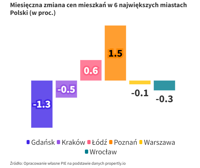 W ujęciu miesięcznym stawki spadały w większości dużych miast, największy 1,3 proc. spadek cen zaobserwowano w Gdańsku, następnie w Krakowie o 0,5 proc. Wzrost odnotowano tylko w Poznaniu i Łodzi, kolejno o 1,5 proc. i 0,6 proc.
