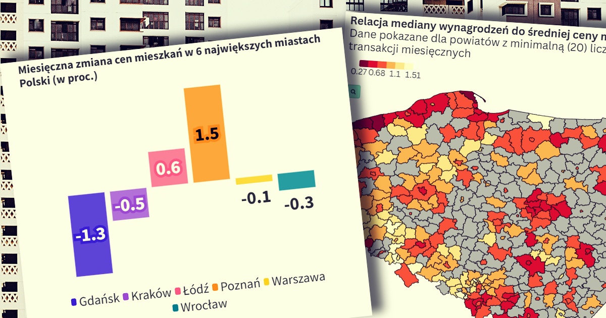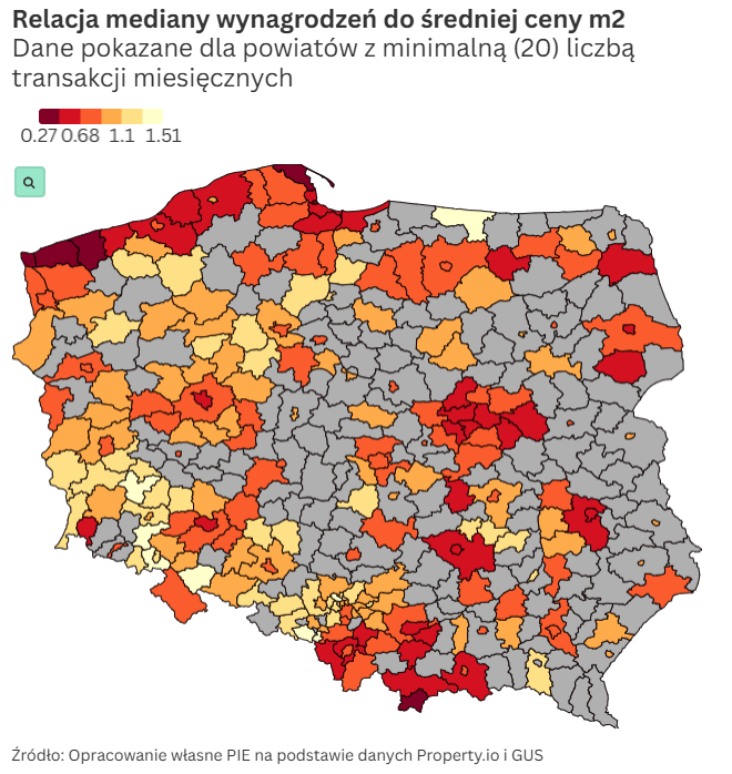 Relacja mediany wynagrodzeń do średniej ceny mkw. najniższa jest w powiatach turystycznych oraz skupia się wokół największych miast. Najmniej dostępne cenowo są nieruchomości w powiecie tatrzańskim, za średnią medianę płacy można tam kupić 0,27 mkw. lokalu mieszkalnego. Na drugim i trzecim miejscu znajdują się Sopot i Świnoujście. W sumie całe pasmo nadmorskie wydaje się mało dostępne cenowo w relacji do wynagrodzenia.