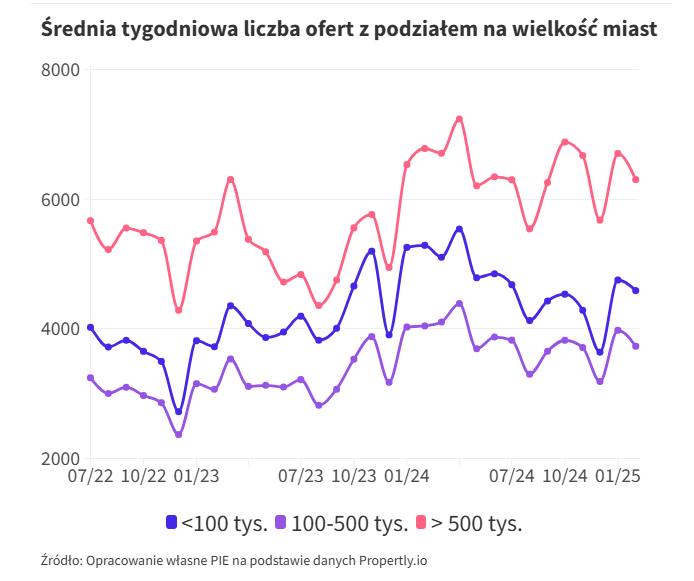 W lutym w 2025 r. średnia tygodniowa liczba ofert sprzedaży mieszkania wyniosła 6,3 tys. w 6 największych miastach. Dla miast mniejszych niż 100 tys. mieszkańców było to 3,7 tys., a dla średnich miast było to 4,5 tys. ofert tygodniowo.