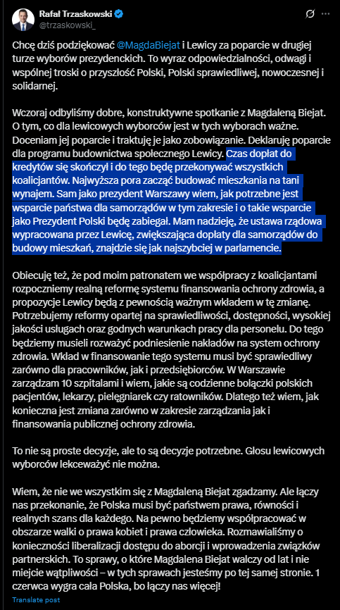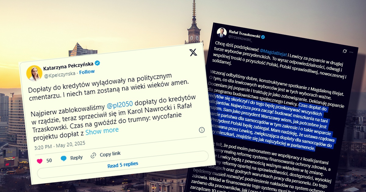 Rafał Trzaskowski, po rozmowach z Magdaleną Biejat i uzyskaniu poparcia od kandydatki Lewicy, zadeklarował, że czas dopłat do kredytów dobiegł końca. Jako kandydat na prezydenta RP zapowiedział wsparcie dla programu budownictwa społecznego.