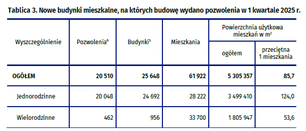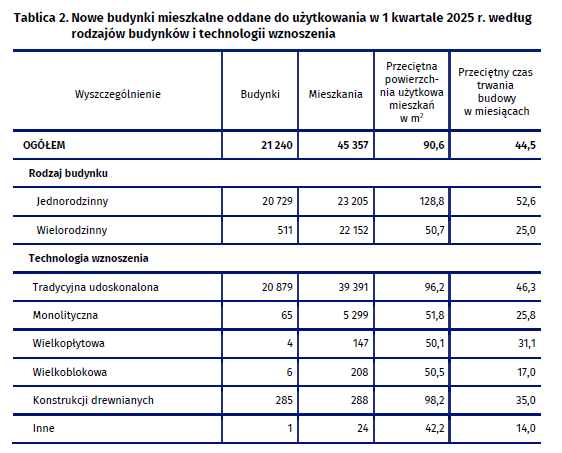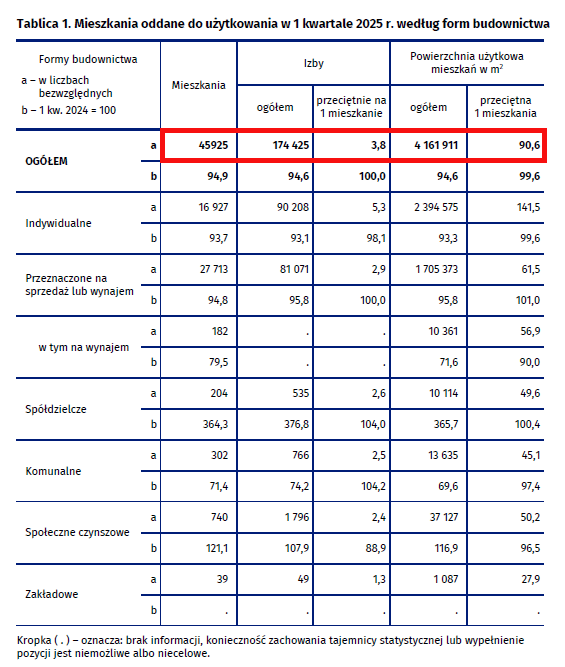 Zgodnie z oficjalnymi liczbami urzędu statystycznego, w I kw. w Polsce oddano do użytkowania niespełna 46 tys. mieszkań, co jest o 2,5 tys. mniejszą liczbą niż w tym samym okresie 2024 roku. Łączna powierzchnia oddanych lokali wyniosła 4,2 mln mkw., to o 5,4 proc. mniej w skali roku. Średnia powierzchnia oddanego mieszkania wyniosła 90,6 mkw., wobec 91,0 mkw. w analogicznym okresie 2024 roku.