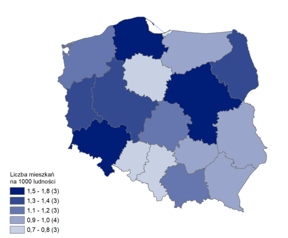 Dane w ujęciu bezwzględnym w układzie terytorialnym wskazują, że najwięcej nowych mieszkań wybudowano w województwach: mazowieckim (21,2% ogółu mieszkań), dolnośląskim (9,9%) i wielkopolskim (9,8%). Najmniejszy był natomiast odsetek mieszkań w województwie opolskim (1,4%) oraz świętokrzyskim (2,2%). Wskaźnik nasilenia budownictwa mieszkaniowego, wyrażony liczbą mieszkań oddanych do użytkowania w przeliczeniu na 1 tys. ludności2, wyniósł dla Polski 1,2 (spadek o 0,1 w porównaniu z analogicznym okresem poprzedniego roku). Największe wartości zanotowano w województwach: mazowieckim (1,8), dolnośląskim (1,6) i pomorskim (1,5), najmniejsze natomiast w: opolskim (0,7) oraz kujawsko-pomorskim i śląskim (po 0,8).