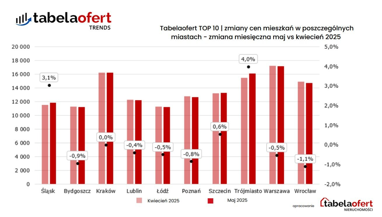 Pośród 10 analizowanych miast, najmocniej (+ 4,0 proc) wzrosły ceny w Trójmieście, gdzie średnio za mkw. trzeba było zapłacić 16,2 tys. zł. Ten właśnie wzrost wynika z nowych wprowadzeń, podobna sytuacja miała miejsce na śląsku.