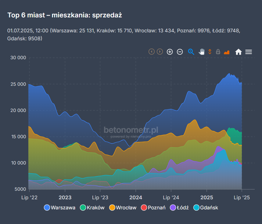 Według danych betonometr.pl, liczba ogłoszeń mieszkań z rynku wtórnego na popularnych serwisach wynosi obecnie 211 tys. To spory spadek względem rekordu z końca marca, kiedy oferta sięgała 242 399 ogłoszeń. Różnica jest znacząca, w ciągu około trzech miesięcy z rynku zniknęło ponad 30 tys. mieszkań.