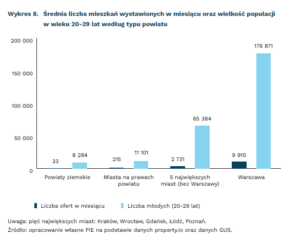 Porównując średnią liczbę mieszkań dostępnych na wynajem w poszczególnych powiatach z liczbą osób w wieku 20–29 lat zameldowanych w danym powiecie, widać, że w Warszawie na każde nowe mieszkanie przypada co najmniej 17 osób w tym wieku, w pozostałych pięciu największych miastach – co najmniej 24, w innych miastach na prawach powiatu – co najmniej 52, a w powiatach ziemskich aż 251 osób.