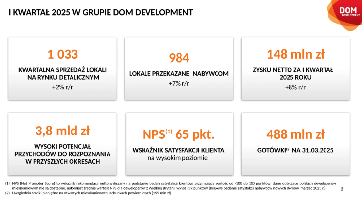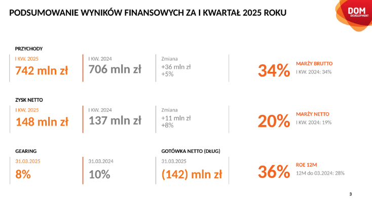 W pierwszych trzech miesiącach 2025 roku klienci Grupy Dom Development odebrali klucze do 984 lokali, czyli o 7 proc. więcej niż w analogicznym okresie 2024 roku. Przełożyło się to na wzrost przychodów ze sprzedaży o 5 proc. r/r do 742 mln zł, a wypracowany w pierwszym kwartale 2025 roku zysk netto wzrósł o 8 proc. r/r i przekroczył 148 mln zł.
