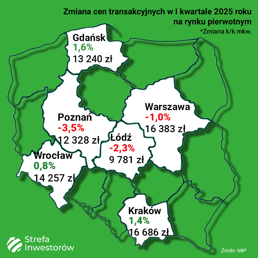 W ujęciu kwartalnym, w porównaniu do IV kwartału 2024 roku, odnotowano spadki cen w większości miast. Najmocniejszy spadek miał miejsce w Gdańsku (–6,7 proc.), a także w Warszawie (–3,0 proc.) i Wrocławiu (–2,1 proc.). Ceny wzrosły jedynie w Łodzi (2,7 proc.), natomiast w Katowicach zmiana była symboliczna i wyniosła 0,2 proc.