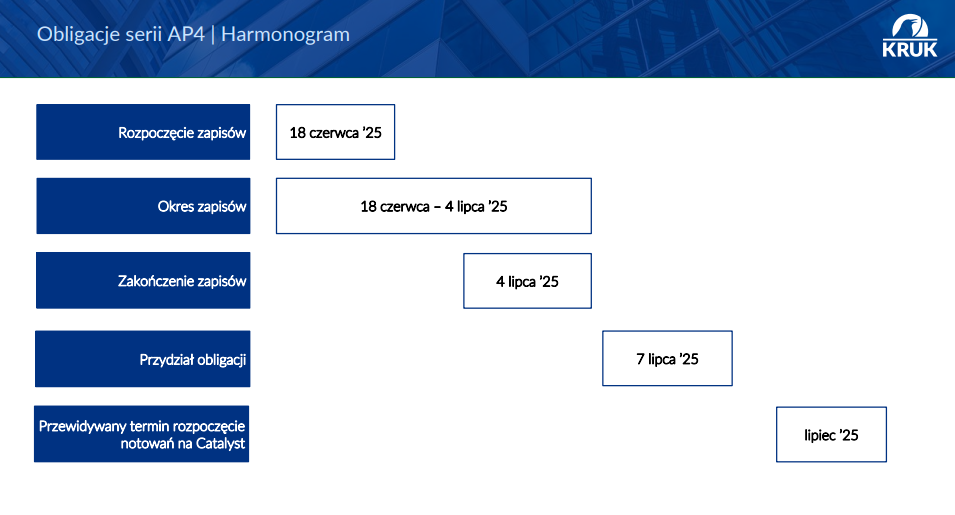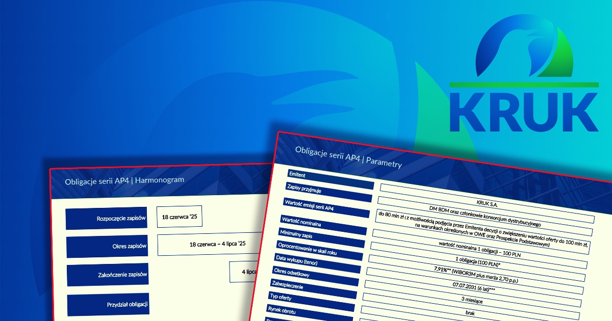 KRUK wyszedł do inwestorów indywidualnych z emisją obligacji serii AP4. Oferta warta jest 80 mln złotych, a zapisy potrwają do 4 lipca 2025 roku.