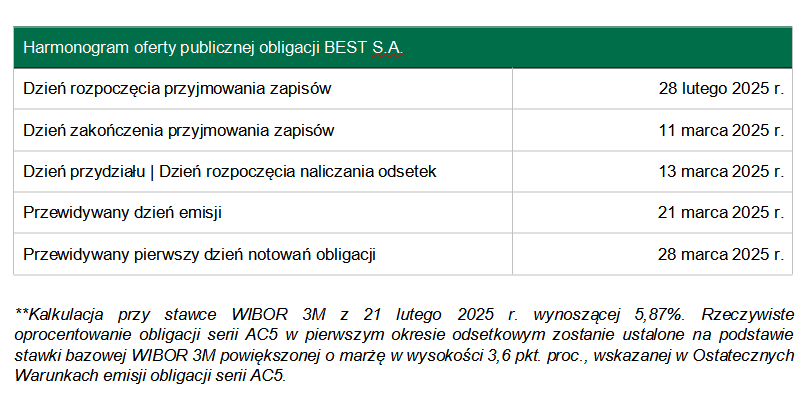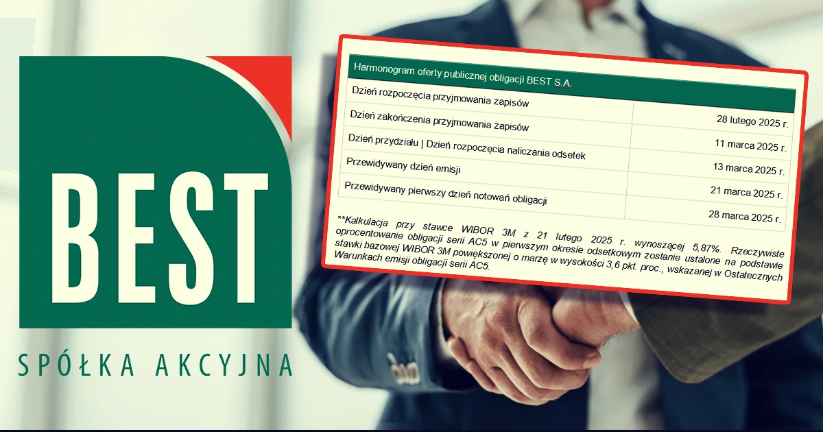 BEST, spółka z branży zarządzania wierzytelnościami rozpoczęła, pierwszą w tym roku, publiczną emisję obligacji, o wartości 83,4 mln zł. Oprocentowanie liczone będzie na podstawie wskaźnika WIBOR 3M powiększonego o 3,6 proc. marży. W pierwszym okresie odsetkowym może wynieść ponad 9,4 proc. Zapisy będą przyjmowane do 11 marca 2025 r.
