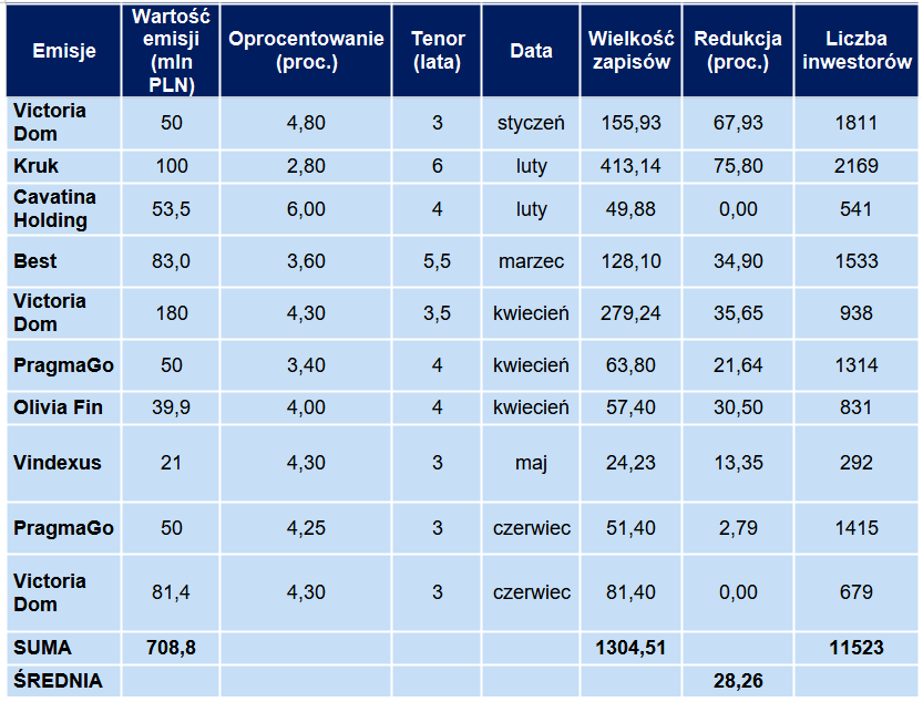 Największą transakcją na rynku publicznym była emisja Vitoria Dom, powiększona ostatecznie do 180 mln zł przy popycie blisko 280 mln zł. Warta uwagi była również emisja Kruka na 100 mln zł oraz grupy BEST na kwotę 83 mln zł. Dwie duże emisje, po 50 mln każda, przeprowadziła także PragmaGO. Wszystkie obligacje cieszyły się sporym popytem, przez co średni poziom redukcji na zapisach wyniósł 28 proc.