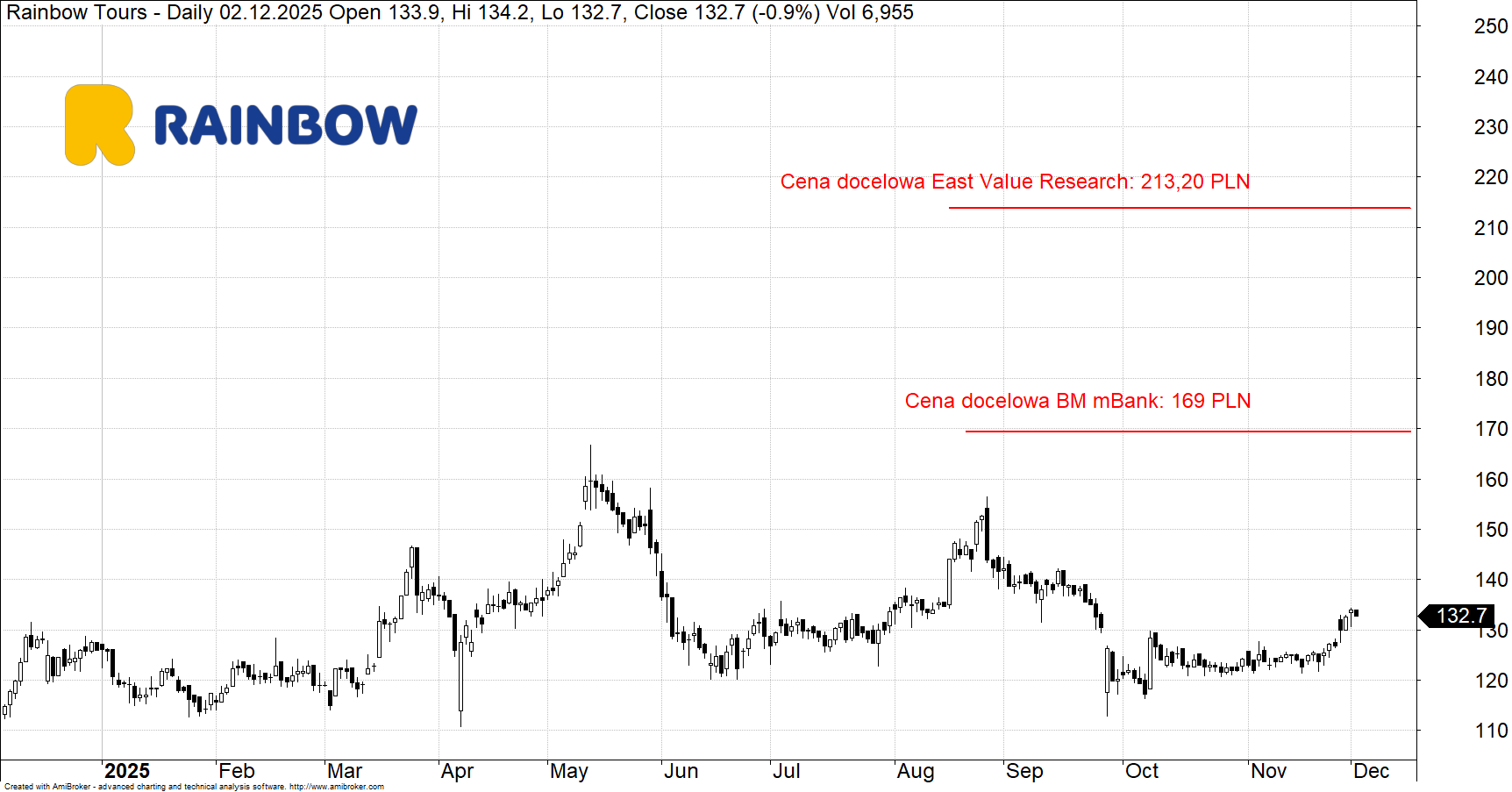 Podobną dynamikę widać w Rainbow Tours. East Value Research dostrzega w biurze podróży przestrzeń do wzrostu kursu z okolic 130,50 zł do 213,20 zł, co przekłada się na około 63 % potencjalnej stopy zwrotu. Co ciekawe, końcówka miesiąca przyniosła drugą rekomendację dla Rainbow, tym razem od BM mBanku. Tutaj także pojawiło się „Kupuj”, ale z bardziej stonowaną ceną docelową 169 zł, dającą ok. 30 % potencjału względem bieżącego kursu. Ten rozstrzał dobrze pokazuje, że nawet przy wspólnie pozytywnym nastawieniu analitycy potrafią zupełnie inaczej wyceniać to samo ryzyko.