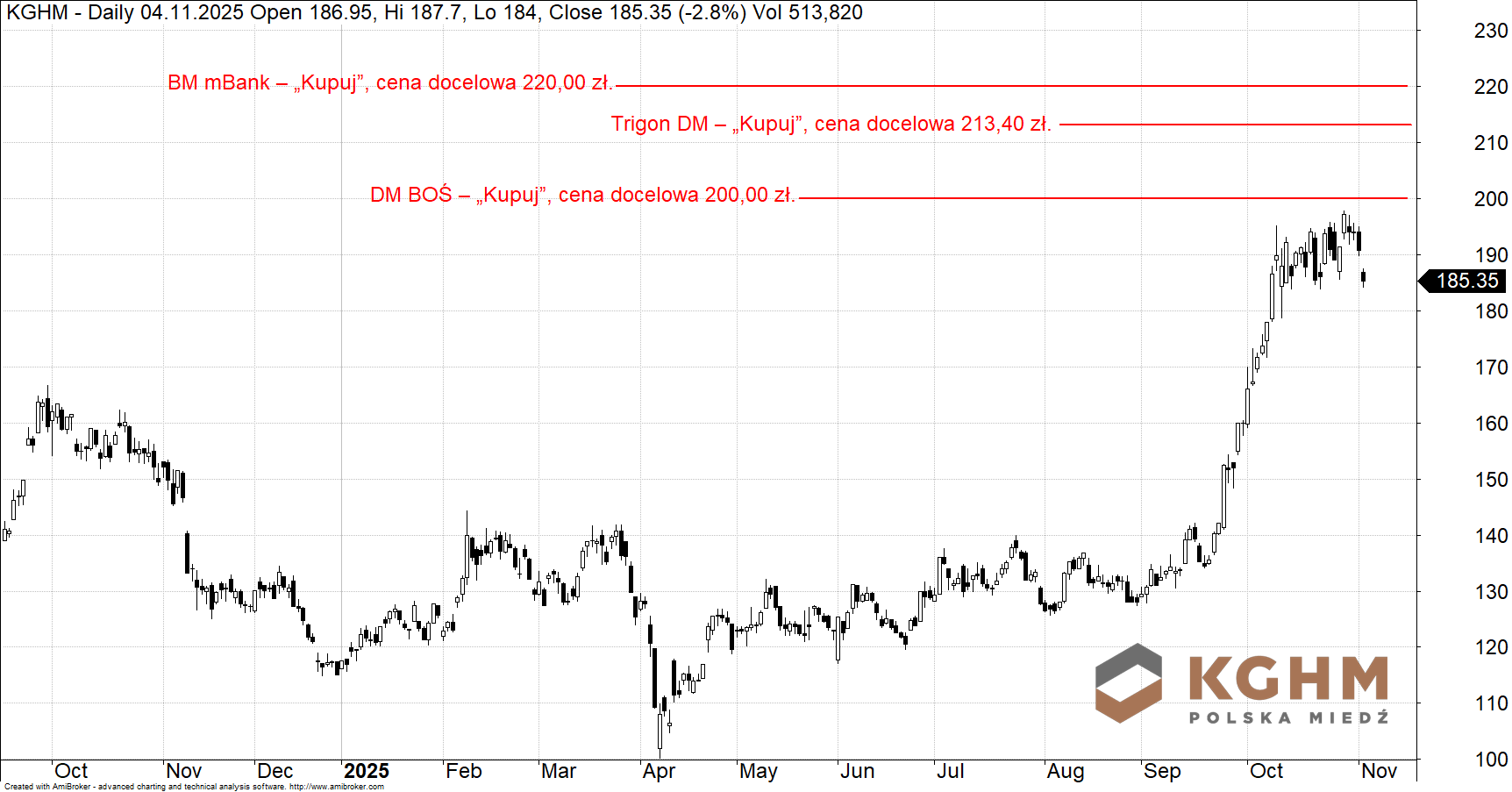| KGHM (KGH) | Kupuj | 191.80 zł | 220.00 zł | 14.70% | 190.25 zł | BM mBank | 16-10-2025 | |