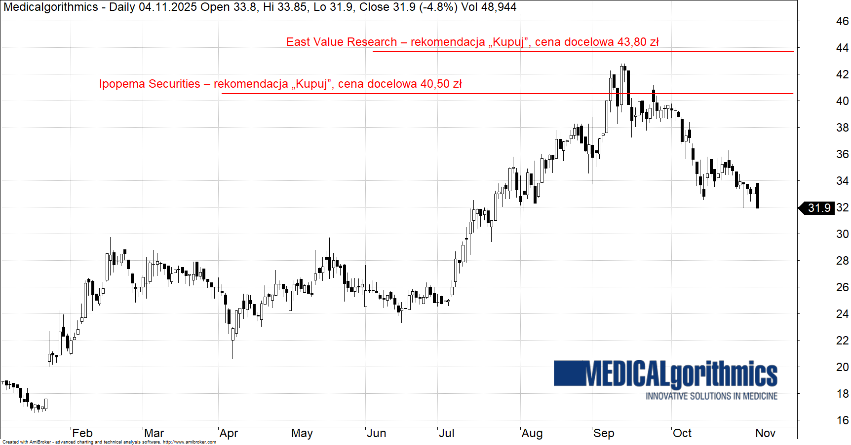 | MEDICALG (MDG)* | Kupuj | 33.70 zł | 40.50 zł | 20.18% | 35.20 zł | Ipopema Securities | 21-10-2025 | |