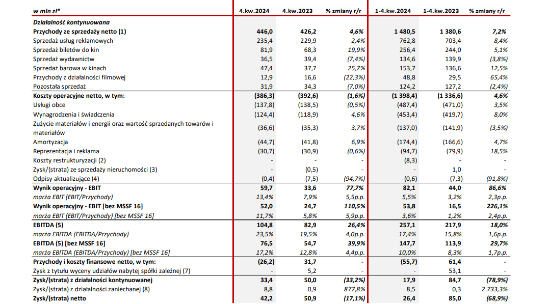 2024 r. Agora zakończyła wzrostem przychodów oraz EBITDA względem poprzedniego roku, do czego w głównej mierze przyczyniła się sprzedaż reklam oraz powrót klientów do kin. W następnych kwartałach firma skupi się na przede wszystkim na obniżeniu kosztów, co związane będzie z integracją grupy Eurozet.