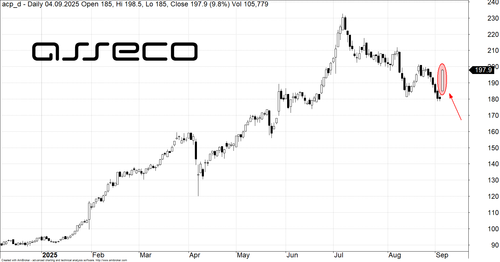 Grupa Asseco zamyka I półrocze 2025 z solidnymi wzrostami w kluczowych liniach biznesowych i koncyliacyjnie “ostrożnym” optymizmem co do drugiego półrocza. Zarząd podkreśla konsekwencję w strategii opartej na własnych produktach i usługach oraz aktywne akwizycje przez spółki wchodzące w skład grupy. Dzisiejsza reakcja kursu Asseco na raport kwartalny może sugerować zakończenie dotychczasowej korekty wcześniejszego, silnego, wielomiesięcznego trendu wzrostowego i powrót na ścieżkę ku maksimom. Miejsce zwrotu (180 zł) z technicznego punktu widzenia wydaje się wzorcową obroną wsparcia.