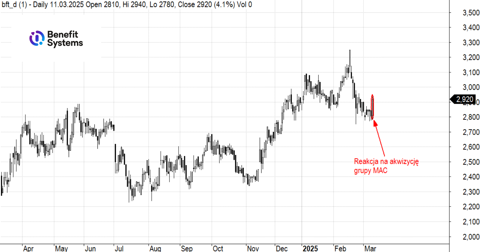 We wtorek po południu notowania Benefit Systemu rosną o 4,8%. Analitycy dostrzegają w transakcji potencjał, wskazując m.in. na rozwinięty biznes MAC, szansę na powtórzenie efektywnego polskiego modelu na zagranicznych rynkach oraz atrakcyjną wycenę.