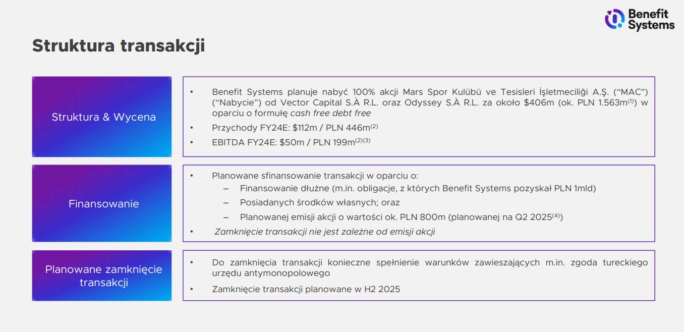Benefit Systems na przejęcie tureckiej firmy wyłoży 420 mln dolarów. Uwzględnić trzeba jeszcze dodatkowe wynagrodzenie narastające w wysokości 7% rocznie, które liczone jest od początku tego roku do zamknięcia transakcji. Spółka spodziewa się zakończenia akwizycji w II półroczu 2025 r. Środki pochodzić będą z trzech źródeł: finansowania dłużnego (w lutym doszło do emisji obligacji opiewających na 1 mld zł - red.), posiadanych środków własnych oraz emisji akcji szacowanej na 800 mln zł. Co ważne, zamknięcie transakcji nie jest uzależnione od powodzenia emisji. Trzeba zaznaczyć, że aby przejęcie doszło do skutku, zgodę musi wyrazić tamtejszy regulator antymonopolowy.