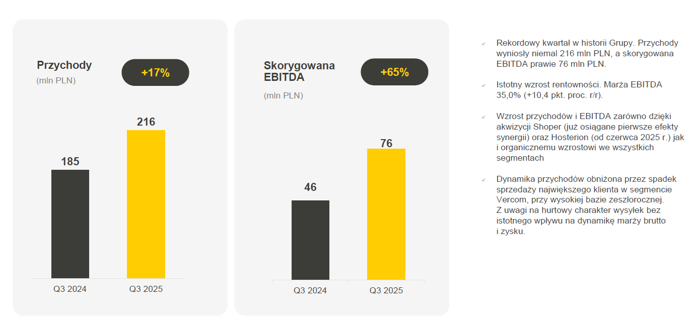 Dynamika wyników napędzana była jednocześnie wzrostami organicznymi we wszystkich segmentach Grupy (cyber_Folks, Shoper, Vercom) oraz efektami przejęć, w szczególności akwizycji Shopera w lutym.