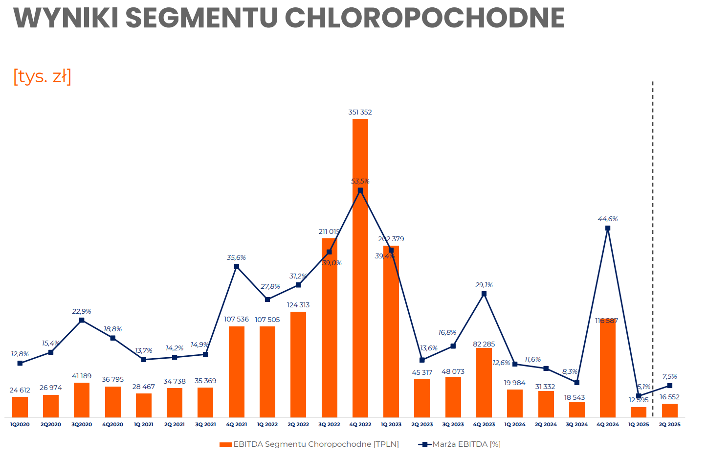 W segmencie Chloropochodne wpływ na wyniki miała sytuacja na rynku tlenku propylenu, niższe ceny sprzedaży kwasu solnego oraz wyższe ceny energii elektrycznej