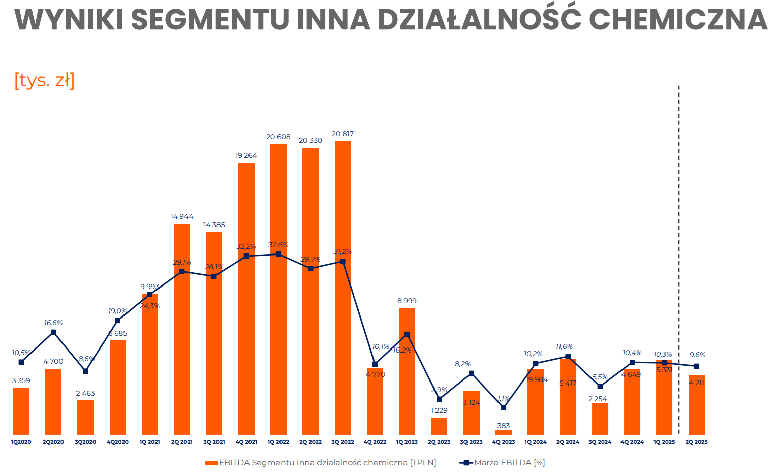 Skonsolidowany zysk EBITDA spadł o 29% r/r, a zysk netto aż o 82% r/r, przy jednoczesnym wzroście EBITDA kw./kw. o blisko 6% w II kwartale 2025 r. Segmentowo: Chloropochodne wygenerowały EBITDA 29,1 mln zł (-55% r/r), Poliuretany 18,2 mln zł (-50% r/r), a Inna działalność chemiczna 9,5 mln zł (-5% r/r).