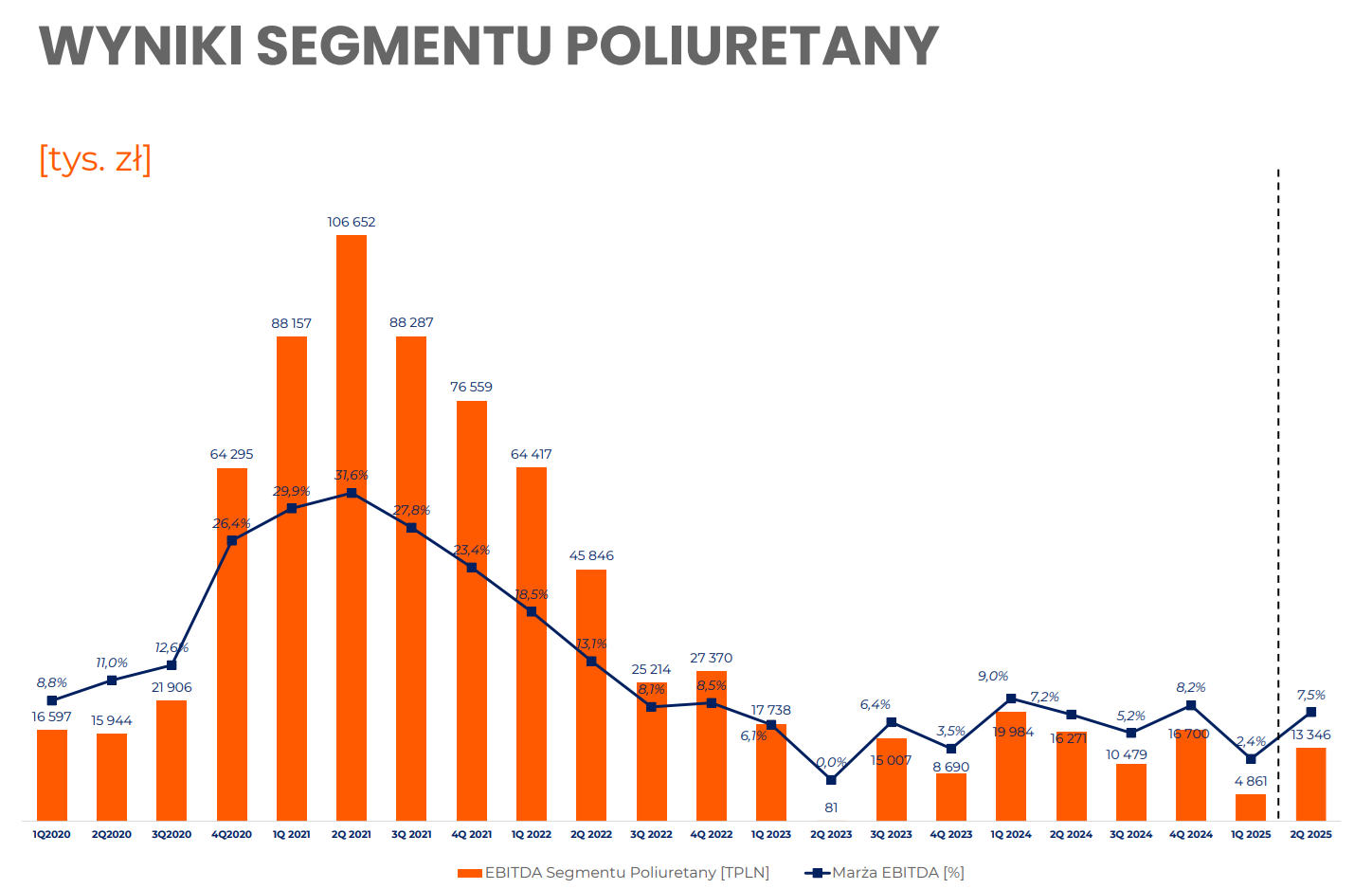 W segmencie Poliuretany kluczowym czynnikiem presji na marże była, według zarządu, „agresywna” sprzedaż azjatyckich producentów polioli oraz globalne nadwyżki, które „zalewają” Europę tańszymi poliolami polieterowymi. Jednocześnie słabła konsumpcja wewnętrzna i zanotowano niższą aktywność w budownictwie, do którego trafia znacząca część produktów segmentu.