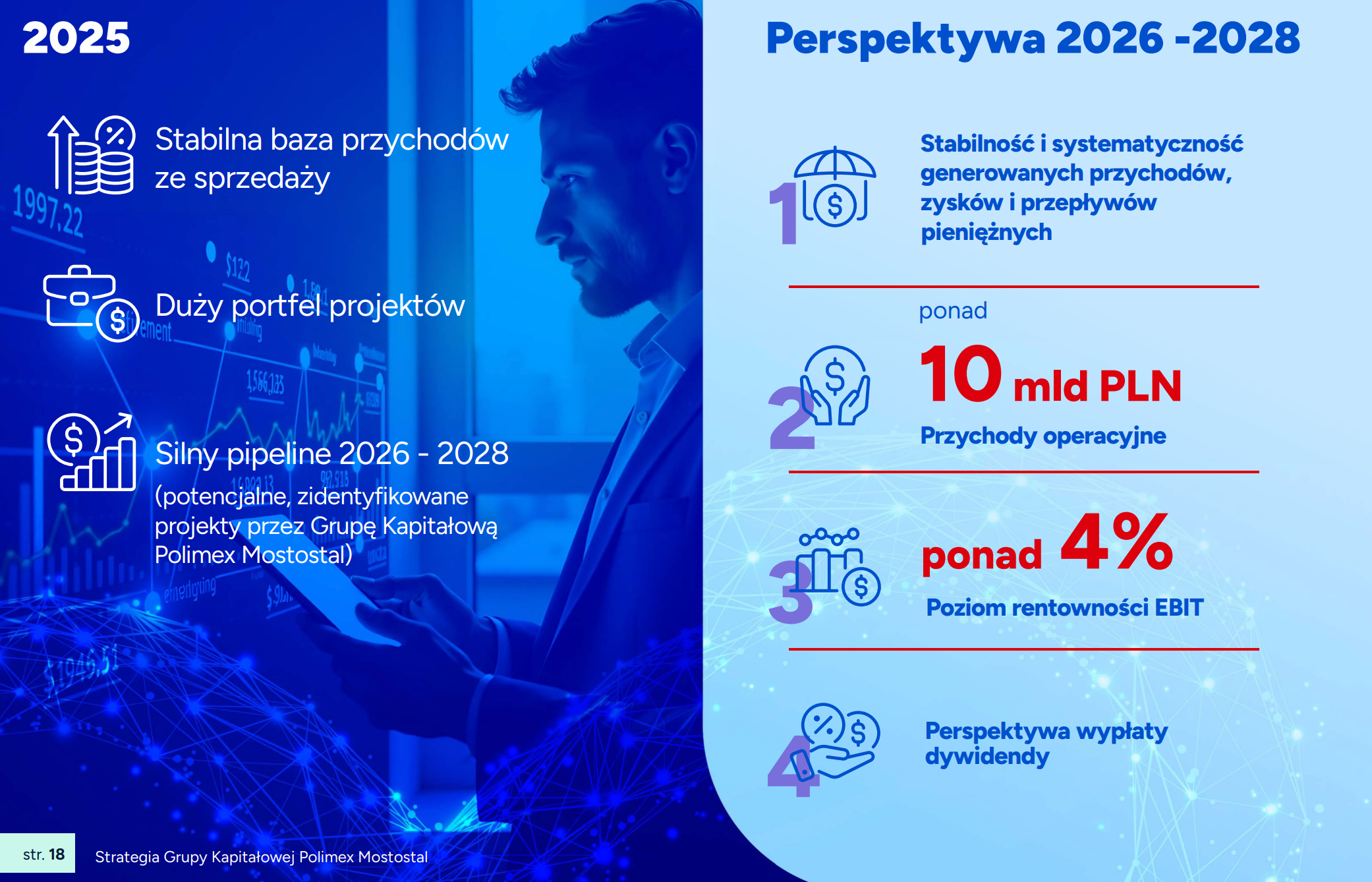 Celem finansowym 2026 - 2028 r. są przychody powyżej 10 mld zł i marża EBIT ponad 4%, z docelową perspektywą wypłaty dywidendy. Podczas konferencji prezes Jakub Stypuła stwierdził, że grupa jest odpowiedzialna, ale może być ambitna wynikowo ponad założenia co zależy od pozyskiwania i realizacji projektów. Temat dywidendy może pojawić się gdzieś w 2028 - 2029, co dla inwestorów giełdowych jest jednak odległą perspektywą.