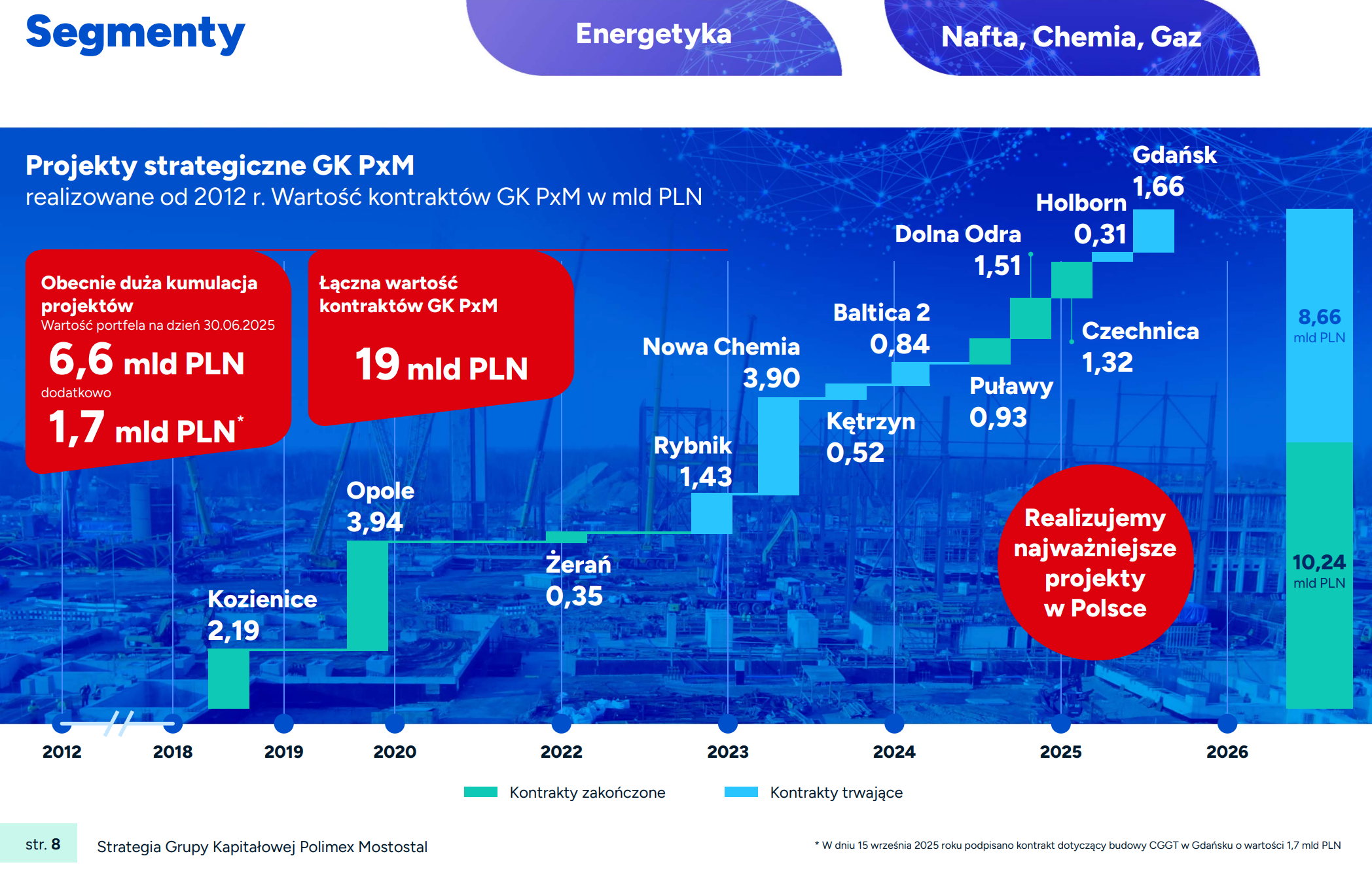 Polimex Mostostal pozostaje liderem budownictwa energetyczno-przemysłowego w Polsce – z portfelem projektów przekraczającym 6,6 mld zł. Spółka posiada ok. 20% udziału w rynku EPC (Engineering, Procurement, Construction) w sektorze energetyki i petrochemii. Dywersyfikacja działalności obejmuje cztery strategiczne filary: Energetyka (13,8 mld zł rynkowego pipeline), Nafta, Chemia, Gaz (6,1 mld zł rynkowego pipeline), produkcja przemysłowa (konstrukcje stalowe, kraty, prefabrykaty) i budownictwo infrastrukturalne i ogólne.