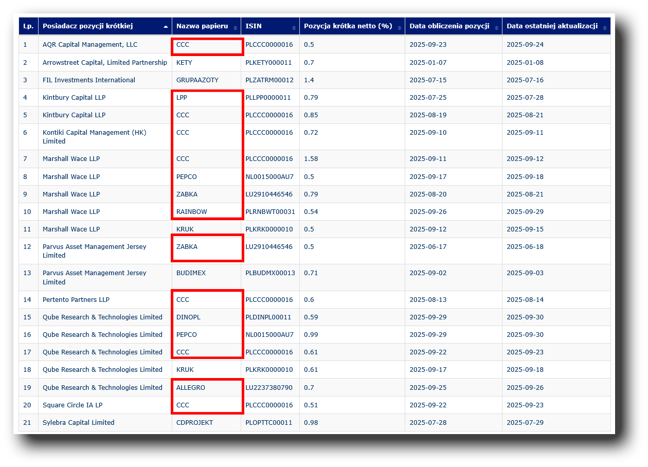 Na koniec września w zestawieniu "Rejestr Krótkiej Sprzedaży", Komisja pokazuje 21 ujawnionych, aktywnych pozycji obejmujących 12 spółek. Warto pamiętać, że widzimy tylko pozycje od 0,5% kapitału – to próg ujawnienia publicznego w Polski i UE. Mniejsze (np. 0,3–0,4%) nie są w rejestrze publicznym, choć podlegają zgłoszeniu do nadzoru. W Polsce próg prywatnego raportowania jest obecnie 0,1% (z wnioskami nadzoru, by go podnieść do 0,2% na zgodność z SSR). W praktyce więc część „shortów” jest niewidoczna w publicznym zestawieniu. Ale te ujawnione przynoszą bardzo ciekawe wnioski…