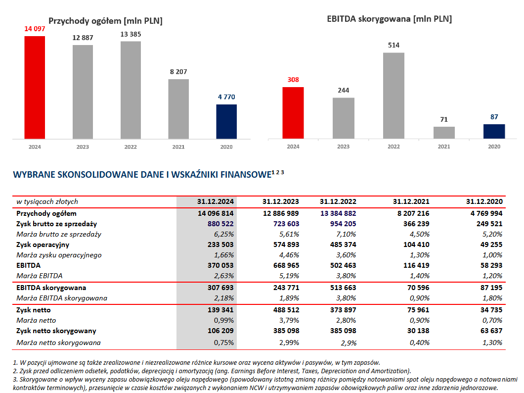 Warto w tym miejscu podkreślić, że wyniki finansowe 2024 r. nie były obciążone dużymi inwestycjami jak w 2023 r., ani też jednorazowymi wydarzeniami jak wojna w Ukrainie, która wywindowała w górę ceny paliw.