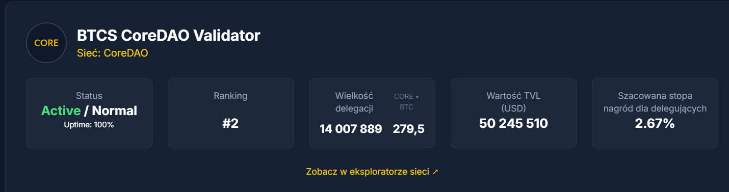 Za to na swojej stronie internetowej (screen powyżej) spółka podaje podstawowe dane. Status walidatora „Active / Normal”, Uptime 100% – oznacza, że walidator przechodzi bieżące kontrole i brał udział w produkcji bloków bez kar. Ranking: #2 – jeżeli to pozycja wg „hybrid score” Core (łączącej delegacje CORE, BTC oraz hashpower BTC), to jest na dany moment bardzo wysoka. Prawdopodobne, że ujawnienie przez BTCS danych walidatora CoreDAO – zwłaszcza skali delegacji (14 mln CORE + 279,5 BTC, TVL ponad 50 mln USD w momencie robienia screena) było jednym z głównych katalizatorów ostatniego wystrzału kursu akcji spółki. Szacowana stopa nagród dla delegujących: 2,67% – to dolny poziom na tle ujęć marketingowych. Metryki wyglądają spójnie jak na walidatora z czołówki CoreDAO. Przydałby się adres on-chain walidatora i portfeli do publicznej weryfikacji.