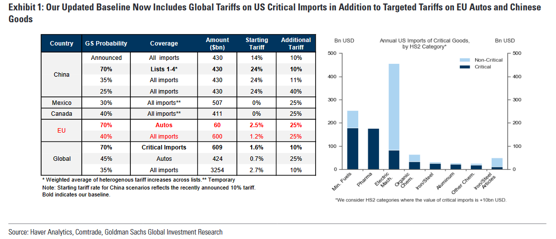 Goldman Sachs prognozuje, że Stany Zjednoczone mogą nałożyć 10% cła na import kluczowych towarów od wszystkich partnerów handlowych, a także podnieść taryfy na europejskie samochody o 25 punktów procentowych oraz na chińskie produkty o 20 punktów procentowych. Nowe regulacje mogą objąć eksport do USA o wartości około 600 miliardów dolarów rocznie.