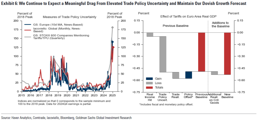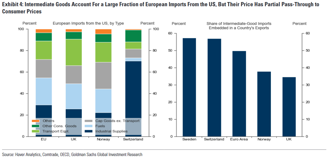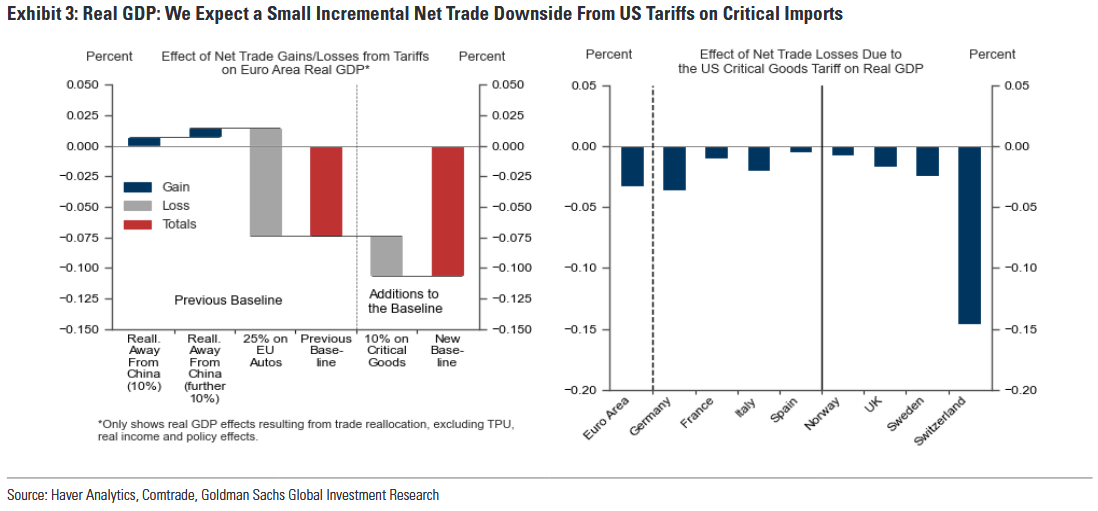 Goldman Sachs przewiduje, że europejskie działania odwetowe skoncentrują się na towarach pośrednich importowanych z USA, co doprowadzi do niewielkiego wzrostu cen konsumpcyjnych w strefie euro. Jednocześnie jednak spadek popytu USA na chińskie towary może stworzyć nadwyżkę podaży, ograniczając presję inflacyjną. Ostatecznie szacuje się, że napięcia handlowe podniosą ceny w strefie euro jedynie o 0,05%.