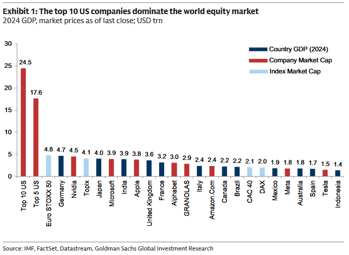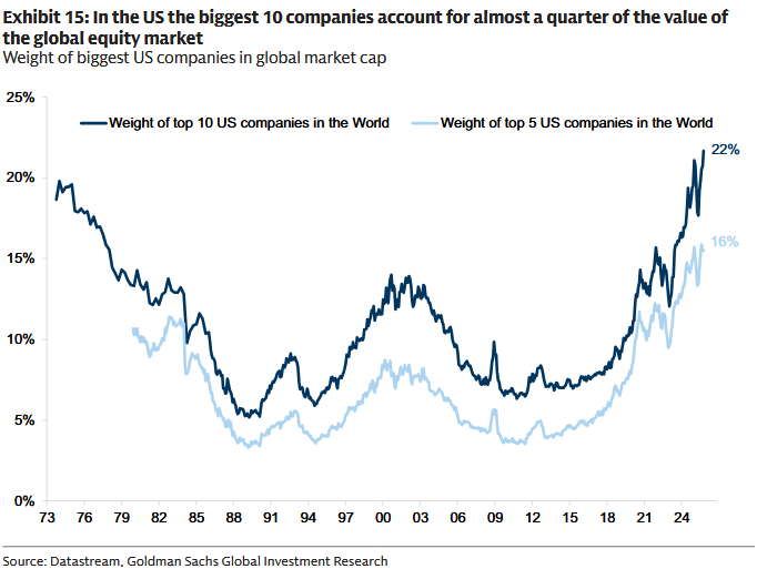 Goldman nie zamiata pod dywan jednego faktu: konsolidacja w indeksach jest rekordowa. „10 największych spółek z USA stanowi prawie jedną czwartą globalnego rynku akcji.” I mocne zdanie, które warto zacytować w całości: „taki poziom koncentracji jest - naszym zdaniem - nie do utrzymania i stoi za naszym naciskiem na dywersyfikację. To jednak nie znaczy, że mamy bańkę, ani że technologia nie może dalej dominować.”