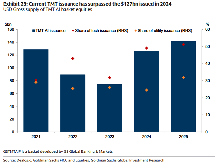 Goldman dorzuca jednak żółtą kartkę: „widać zwrot w stronę finansowania długiem”, gdy gotówka się kurczy - od emisji pod centra danych po vendor financing; technologia dominuje w tegorocznych emisjach korporacyjnych. To sygnał do większej selektywności.