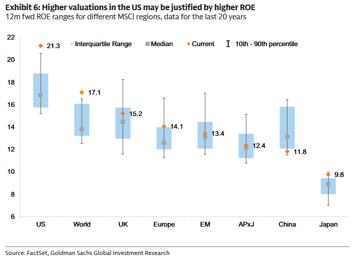 Goldman nie każe fetyszyzować jednego motywu. Zamiast tego: dywersyfikuj. „Skupiamy się na strategiach dywersyfikacji” - piszą autorzy - bo koncentracja jest wysoka, a rynek szeroko jest „drogi”. Równolegle zwracają uwagę, że poza USA też pojawiają się kieszenie wartości, a wyższe ROE w USA częściowo uzasadnia różnicę w wycenach.