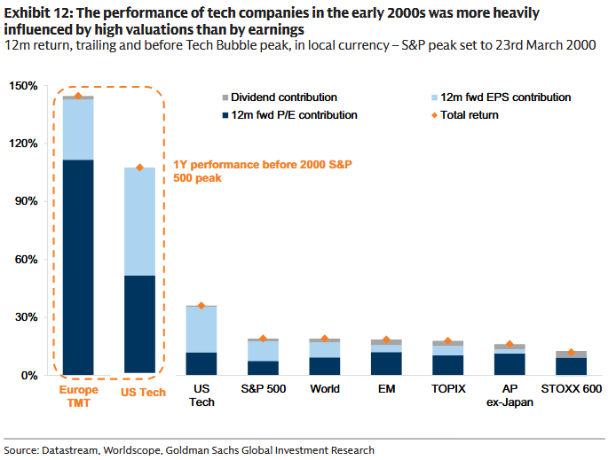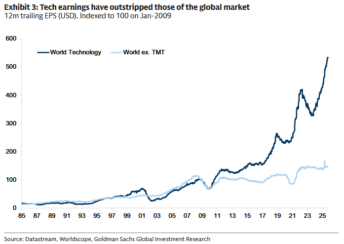 „Wyceny wyglądają coraz bardziej napięte, ale wciąż nie są na poziomach typowych dla baniek tuż przed pęknięciem” - pisze Goldman. Najmocniejszy argument? Rozbicie ostatnich stóp zwrotu na zyski i mnożniki. Przed szczytem dot-comów lwia część rajdu to była ekspansja wycen; dziś większą rolę gra wzrost zysków.