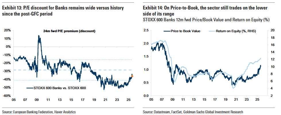 W sektorach akcenty są czytelne. Overweight idzie do banków, telekomów, technologii i detalistów - mieszanka cykliczna i defensywna, ale z przewagą „domowych” cash-flowów i solidnym zwrotem dla akcjonariuszy. Dla banków Goldman przypomina: TSR ok. 9% (dywidendy + buybacki), szeroka zniżka P/E vs historia i atrakcyjne P/B na tle ROE.